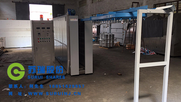 行走装置构成:由悬挂输送链条在箱体的内顶和箱体外面循环输送,通过减速机驱动进行行走,输送链两侧均匀布置远中波镀金加热管进行双面辐射加热。